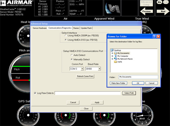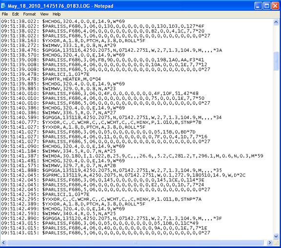 Airmar的WeatherCaster PC軟件可以將來自Airmar氣象傳感器的原始數據記錄到文本(.txt)文件中。此選項位于高級設置下面的“Communications/Diagnostics”選項卡下。使用窗口左下方的復選框來選擇您PC上的保存路徑來記錄文件。請注意,如果您長時間運行WeatherCaster軟件,文本文件將非常大。如果WeatherCaster軟件運行時間超過24小時,則當新的一天開始于上午12:00時,將自動創建一個新的數據文件,并且該日志文件將保存在計算機上與上一個數據文件相同的位置。文件名將包含日期,例如May_18_2010_1475176_0183.LOG。該文件可以使用記事本打開。高級用戶可以將數據導出到Excel電子表格中進行制圖。
