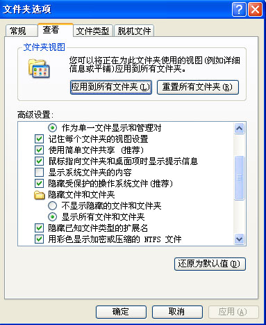 2、顯示所有文件夾,打開工具/文件夾選項,點擊“查看”選項卡,勾選“顯示所有文件和文件夾”,如下圖所示: