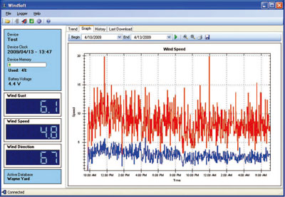 可以使用標配的4.5米長的USB數據線和免費的基于Windows的WindSoft軟件從WindLog下載數據,該軟件使用SQLite數據庫來追蹤和記錄風數據。存儲時間間隔可以設置為從1分鐘到1小時不等。USB延長器可以將USB線延長到30米。USB數據線與WindLog風速儀一直連接的情況下,可在電腦上實時顯示風速風向數據。結合存儲數據和實時數據,WindLog可以在線或離線使用。WindSoft軟件可以生成統計信息、圖形和報告。它也可以導出CSV文件,可以使用Excel或其他支持CSV文件的應用程序打開。