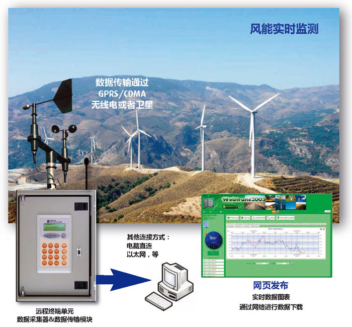 WindPower風能監測系統的基礎是METEODATA-2000/3000C數據采集中心單元,其兼具數據采集器、PLC和RTU的功能,并與專業軟件進行配套使用。這款高級的風能監測系統可幫助您選擇合適的風力發電機組的安裝地點,同時也進行一些其他的測量,來進行遠程控制,或者生成可自定義的警報設置。遠程監測數據可通過GPRS/CDMA蜂窩網絡、無線電、衛星、以太網等方式進行傳輸,也可以通過WEBTRANS平臺以網頁的方式進行傳輸。詳細的數據傳輸方案請與我們聯系。